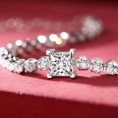 A woman in a white lace dress and red heart-shaped sunglasses, sitting in a shopping cart filled with tennis balls.