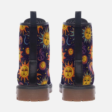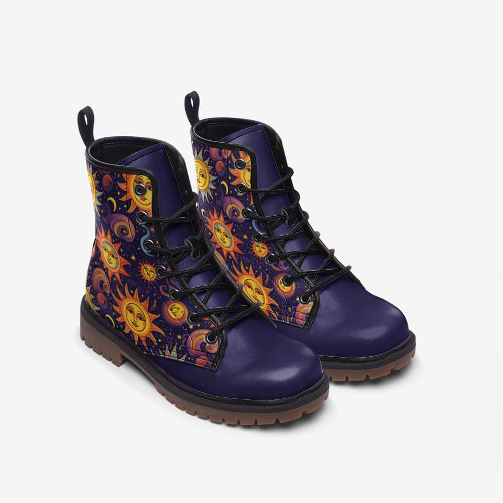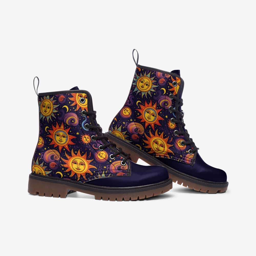 Sun and Moon Vegan Leather Boots bring cosmic charm and timeless balance to your wardrobe. Crafted from smooth, durable vegan leather, they offer structure with a soft, broken-in comfort that feels perfect from the first step. A cushioned interior and sturdy sole provide lasting support, while the celestial sun and moon artwork glows with quiet sophistication.